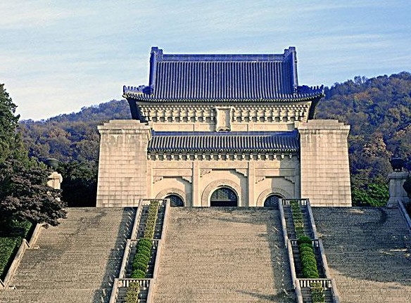 여기서 카트를 타고 언덕을 넘으면 중국의 국부로 존경 받는 쑨원의 릉인 중산릉이 나옵니다. 비록 쑨원이 베이징에서 세상을 떠났지만 자신과 인연이 깊은 난징에 묻히길 원했고, 장제스에 의해 거대한 왕릉급으로 조성되었습니다. 면적이 맞은편 명효릉의 1.5배에 달하는 크기지요. 수많은 계단을 오르면 거대한 규모의 묘당이 나오고 그 안에 대리석 관위로 두 손을 포갠 채 잠들어 있는 쑨 원상이 눈길을 끕니다. 위에는 쑨원이 제창한 민족, 민권, 민생 등 삼민주의의 이념이 새겨져 있지요 천장은 삼민주의의 상징적인 그림이 있는데 대만의 청청 백일기가 그려져 있지요.