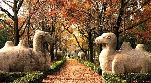 명효릉은 정말 거대합니다. 주원장이 살아생전에 32년간 공사를 했었고, 뒤에 이어진 명13릉과 청나라 황릉의 표본이 되었으니 말이죠. 골프장 카트를 타고 들어가면 먼저 신도가 나오고 일렬로 거대한 석상이 늘어서 있습니다. 기린, 낙타 등 12쌍의 동물을 볼 수 있는 거죠. 산책로도 훌륭하지만 아쉬운 건 문화재인 석상에 사람들이 올라타서 사진을 찍는 게 좀 보기 안 좋았습니다. 여기를 지나면 명 효릉 구역으로 들어가는 거죠. 명루를 따라 올라가면 뒤에 산이 나오는데 이 산 자체가 명나라 태조의 무덤이라고 합니다. 손권의 릉은 명효릉 구역에서 옆길로 가면 손권의 동상과 자그마한 기념관이 있는 손 권원이 나오는데 봉분의 흔적은 찾기 어려운 심심한 장소가 손권의 릉이라고 합니다.